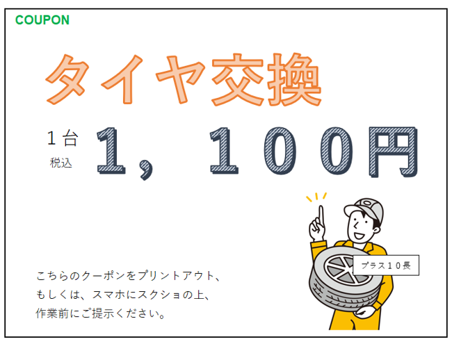 タイヤ交換が通常1台3,300円のところ、1,100円でできます。